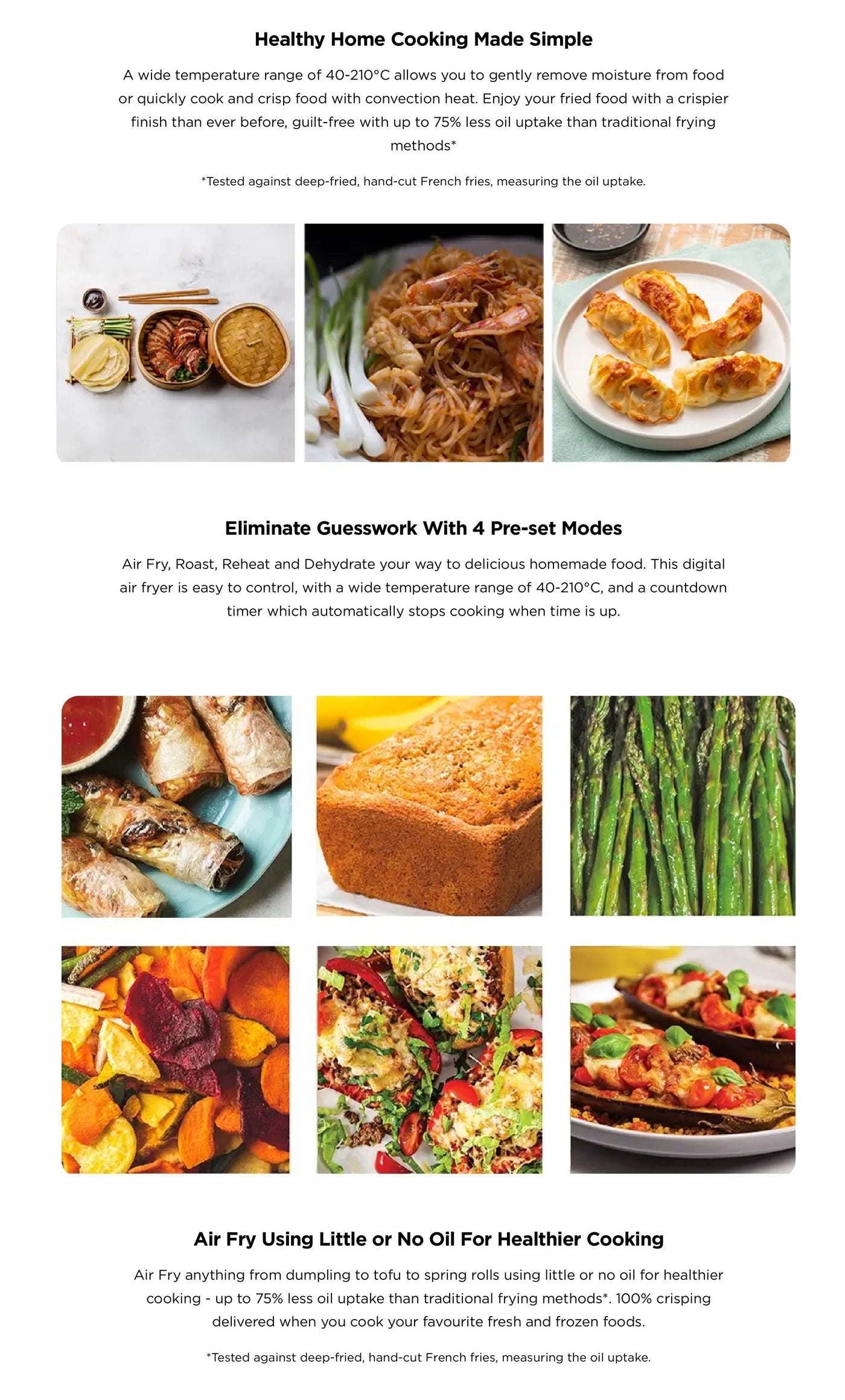Features:1. 3 Dimensional Circulation Around Internal Cavity 2. Non-Stick Coating Food Basket & Food Pan 3. 4.5L Cooking Capacity 4. 30 Minutes Timer 5. 80-200C Temperature Setting 6. Accessible Handle for Easy Carrying Specifications: Voltage / Frequency 220 - 240V / 50/60Hz Rated Power 1500W Cooking Capacity 4.5L Product Dimensions W386 x...