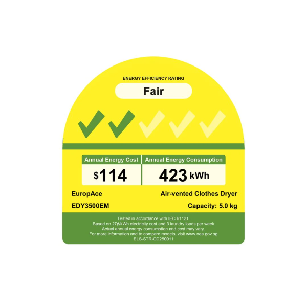 Features: Loading capacity: 7kg Programmes Indicator 15 drying programmes Automatic sensor drying Auto Anti-Crease Function Buzzer Mute Function Time delay: 3,6,9 hours Reverse Tumbling Action Large door for easy loading/unloading Galvanized Drum Drum Light Vent Hose Included Performance: Energy efficiency: √√ NEA registration no.: MELS-CAS-C...