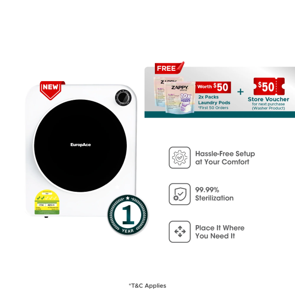 - EuropAce EDY3500EMWH Moon Series 5KG Compact Dryer 99.99% Sterilization, Plug & Use