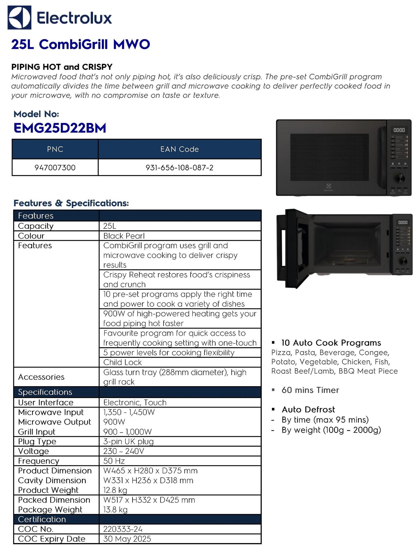 - Electrolux 25L CombiGrill Microwave Oven with 900W Power