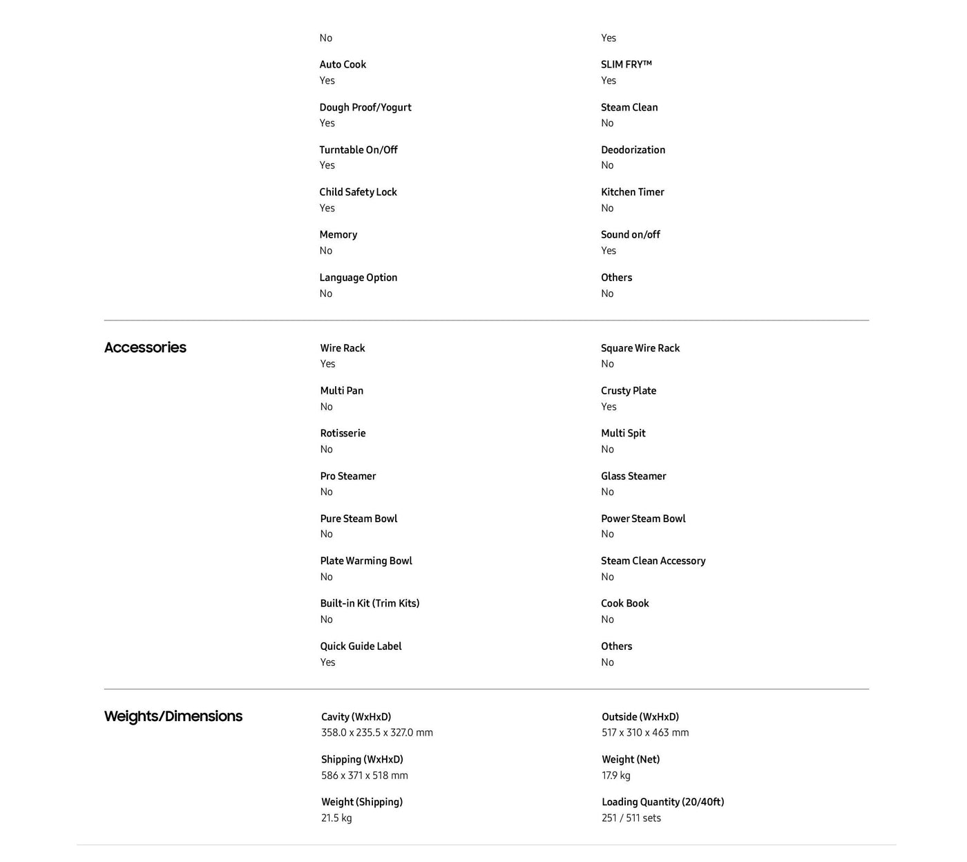 Type Product Type: Grill Installation Type: Freestanding Capacity Oven Capacity: 23L (0.8 Cu.ft) Materials/Finishes Color(Door): Black Color(Cabinet): Black Control Method: Tact Door Type: Handle Cavity Material: Ceramic Enamel Turntable Size: 288 mm Display Type: LED (Ice Blue) Grill Heater: Sheath Heater Power/Ratings Power Source: 230...