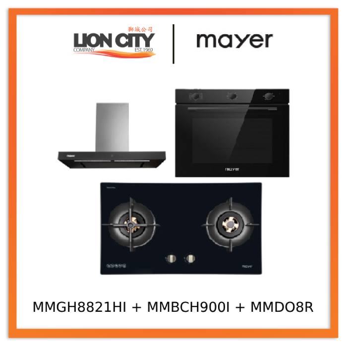 1. Mayer MMGH772/SS772 Built-In Gas Hob Type of Burner: Gas No. of Burner: 2 Burners Power Comsumption: 2x Brass Burner (2 x 4.5Kw) Dimension L x W x H : 760 x 450 x 62 (mm) Cut-out Dimension L x W : 670-725 x 370-410 (mm) 2 x Brass Burner : 4.5kW 2. MMSI900LEDHS 90cm Semi-integrated Slimline Hood Features: 3x Aluminium Grease Filter H...