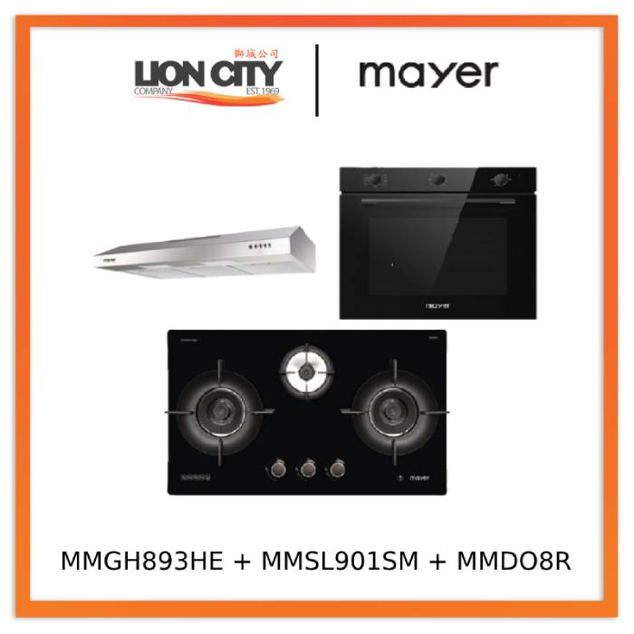 *All items available for online purchase are not guaranteed to be in stock at the time of order processing. In the event that we are unable to fulfill your order, we will contact you with an alternative, or given a full refund.Mayer MMGH893HE 86cm 3 Burner Gas Hob + MMSL901SM 90 Cm Slimline Hood + MMDO8R 60 cm Built-in Oven with Smoke Ventilation
