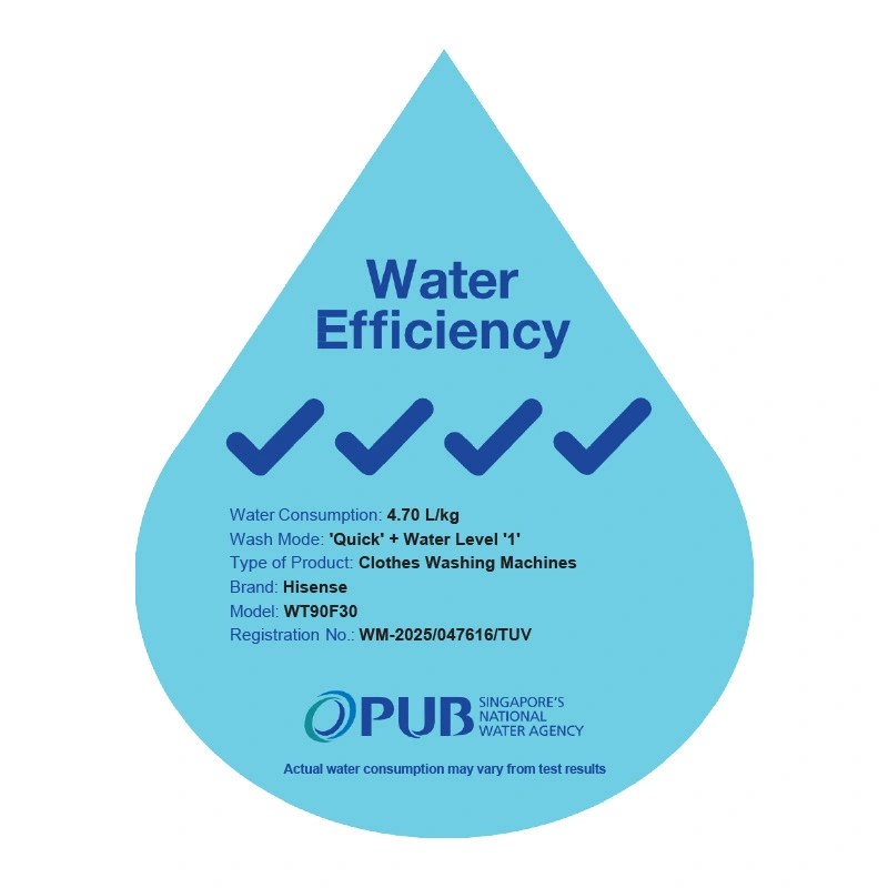 The Hisense F30 top‑load washer offers an 8 kg drum capacity, One Touch AI wash technology, and a soft‑close glass lid. Its overall dimensions are 53.2 × 53.2 × 92.0 cm and it weighs 39 kg, fitting standard laundry spaces. Pause & Add functionality allows garments to be added mid‑cycle, and the water‑saving design meets Singapore efficiency ...